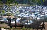 Les parkings épousent les prairies, carcasses ondulant au soleil.