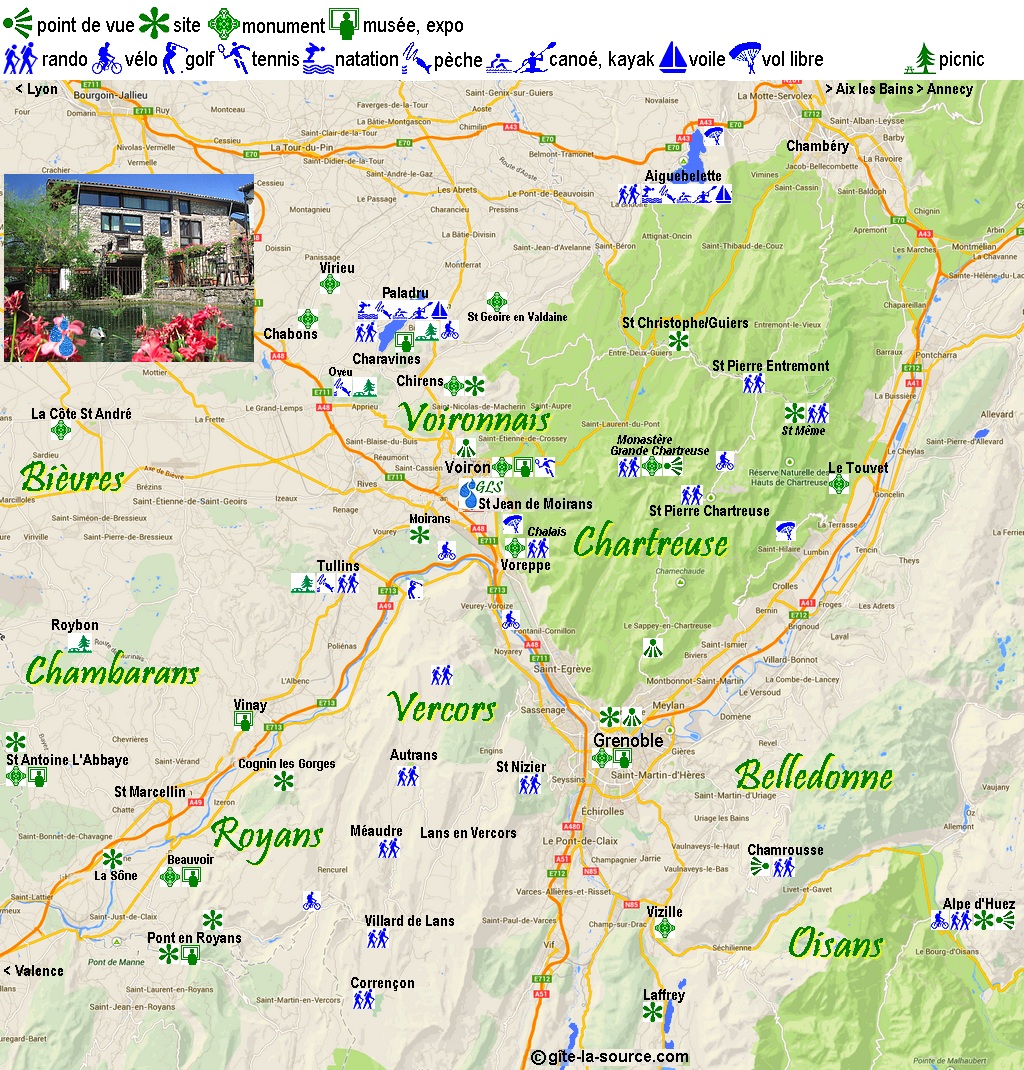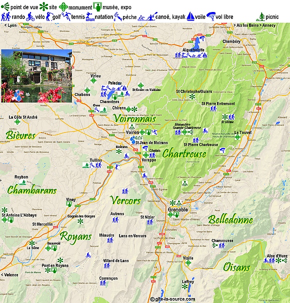 été... rando, vélo, voile, canoë, kayak, vol libre, équitation... A quelques pas de Grenoble ville des Jeux Olympiques d'hiver, le Gîte La Source est idéalement situé au carrefour des massifs grenoblois. L'Isère c'est un choix de loisirs étendu avec des équipements sportifs, des découvertes, de nombreux lieux culturels. En Isère chaque espace naturel se transforme en terrain de sport pour amateurs et passionnés. Partez sur les chemins à pied ou à cheval, pratiquez tous les sports d'eau sur les nombreux lacs. Les amoureux de grimpe ont aussi leurs spots privilégiés, il ne reste plus qu'à choisir ! L'Isère, cette région naturellement contrastée, source inépuisable de dépaysement, n'en finira pas de vous surprendre. 3 chemins de fers touristiques 5 000 kilomètres de randonnées 3 grottes aménagées 14 parcours de golf des centres équestres 1 patinoire couverte 2 piscines olympiques 1 stade d'agglomération de 20 000 places 1 bowling de 24 pistes... ![]() ![]() |