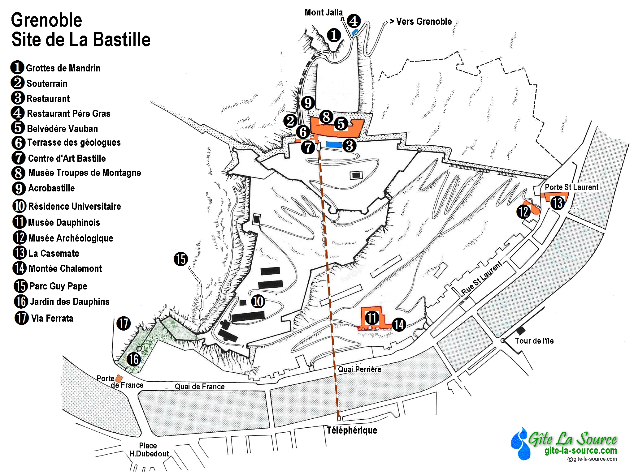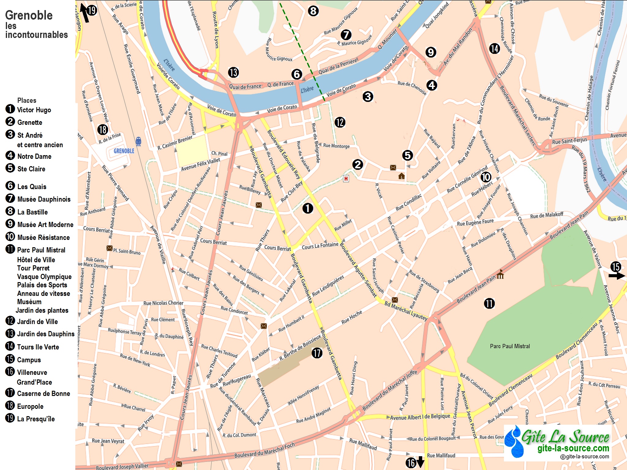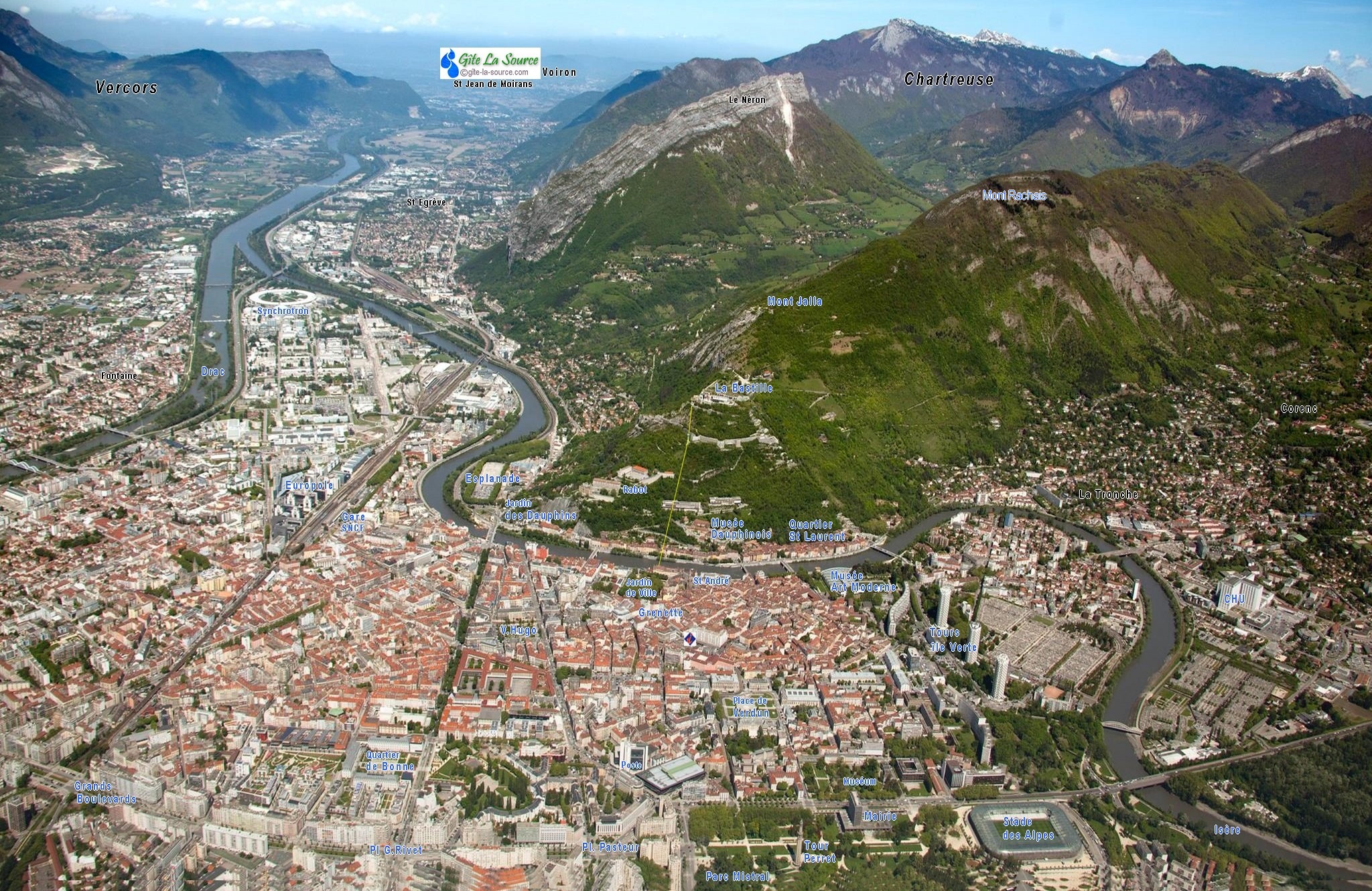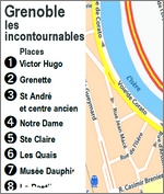 capitale des Alpes. Comment faire pour voir le plus possible de Grenoble en un minimum de temps ? Quand on n'a qu'une journée, ou même un week-end. Pour une telle ville c’est une gageure, tentons quand même.. En choisissant selon ses envies ! ![]() les places les quais les musées les parcs la Bastille l'architecture les JO ![]() "Au bout de chaque rue, une montagne" écrivait Stendhal, le plus célèbre des Grenoblois. Cernée par trois massifs, Vercors, Chartreuse et Belledonne, la capitale des Alpes est au carrefour de vallées aérées et majestueuses creusées par l'Isère et le Drac. La montagne est un décor formidable, mais pas que… ![]() Il faut découvrir tout ce que la ville a de meilleur, de son passé historique à son étonnante qualité de vivre. ![]() 2000 ans d'histoire. Grenoble c’est 2000 ans d’histoire, de la ville la plus plate de France. À l’époque gallo-romaine, elle portait le nom de Cularo puis Gratianopolis. Au Moyen Age, elle est la capitale mythique de la province médiévale du Dauphiné. ![]() A la Révolution, le Dauphiné est partagé en 3 départements, Drôme, Hautes-Alpes et Isère. La ville n’en a pas perdu son charme, et son importance symbolique. De son passé gallo-romain et son statut de capitale du Dauphiné, Grenoble a conservé un patrimoine architectural très dense. Plus grande métropole alpine en Europe, devenue "Capitale des Alpes" elle a connu une industrialisation remarquable tout au long du XXe siècle. Un développement économique et culturel étonnant, dont le point culminant furent les Jeux olympiques d’hiver de 1968. ![]() Ville olympique, ville jeune et universitaire, ville touristique attirante, elle ne cesse de briller dans les sphères scientifiques par ses nombreux centres de recherche. De multiples jalons d'une histoire riche et mouvementée foisonnent dans une ville qui cultive son art de vivre. ![]() ![]() Choisir selon ses envies. Grenoble a plus d’un tour dans son sac pour nous attirer. Fouillons dans nos sacs à dos ! ![]() ![]() ![]() Le centre. Partons le nez en l'air dans des lieux pétris d’histoire, de la place Victor Hugo à la place Grenette, à la place Saint-André, la place aux herbes, d’Agier, de Gordes, vers la place Notre Dame et Ste Claire… ![]() Place Victor Hugo. Construite à la fin du 19e siècle. Elégante place arborée de marronniers centenaires. Cœur de la ville, la place Victor Hugo est l’un des lieux bobos chics de Grenoble. Le style architectural classique des bâtiments et les noms d’enseigne des magasins donnent une ambiance parisienne. Là on se retrouve pour flâner sur les bancs et l’herbe autour de la fontaine, manger quelques marrons chauds ou une glace selon la saison, ou encore participer à des manifestations culturelles. ![]() ![]() ![]() ![]() Place Grenette. ‘’Place du Breuil’’ au Moyen Age elle servait de foire et de marché à bestiaux. Aujourd’hui c’est le centre animé de la ville, la foire au café, et des centaines de clients se pressent dans les terrasses et les restaurants. Au bout de la place siège la Fontaine, véritable œuvre monumentale, le Château d’eau édifié en 1824 en reconnaissance au marquis de la Valette, maire et précurseur de l'installation des fontaines à Grenoble. ![]() ![]() ![]() Quatre bronzes du sculpteur Sappey, représentant des dauphins chevauchés par des angelots ornent les quatre coins de la Fontaine. ![]() Place de Verdun. La place de Verdun a une importance administrative, symbolique et culturelle. Autrefois place d'armes servant aux représentations militaires, elle a conservé des traits de cette période du second empire. ![]() Les bâtiments en calcaire qui entourent la place sont restés pratiquement intact. Sur ses côtés l'hôtel de préfecture de l'Isère, l’ancien musée-bibliothèque, l'hôtel des troupes de montagne de Grenoble et l'ancien cercle militaire. ![]() ![]() Le recul permet des perspectives sur Belledonne, la Bastille ou la Chartreuse. ![]() Place de Gordes. Un peu dissimulée, réservée au piéton elle est protégée du brouhaha du centre ville. Au centre de la place une ancienne fontaine, ornée par une statue de Jean Esprit Marcellin, ‘Le Berger Cyparisse’ qui représente, selon une légende mythologique grecque, le jeune berger Cyparisse berçant tendrement une jeune biche à l'agonie. ![]() ![]() Et tout autour une floraison de bars et restaurants. ![]() Place d'Agier. Charmante placette presque dissimulée entre le Jardin de Ville et la Collégiale Saint André. Elle s'appelait autrefois rue Derrière-Saint-André. Particulièrement calme la journée, à la nuit tombée, la place est plus animée sur la route de la Place du Tribunal, qui est de notoriété pour "boire un coup". ![]() ![]() ![]() Place St André. Ici siégeait le parlement dauphinois avant la Révolution Française. Elle est également appelée "Place du tribunal" car s’y trouvait le palais de Justice de Grenoble, avant qu'il ne soit déplacé dans le quartier Europole. Très belle place, récemment rénovée, elle est renommée pour abriter le Théâtre de Grenoble. ![]() ![]() Très animée le soir, les nombreuses terrasses de bistrots qui bordent la place permettent de prendre un verre dans un cadre agréable car entièrement piétonnier. La "Table Ronde" est l’un des plus vieux bars de France ! Au milieu de la Place Saint André trône la statue de Pierre Terrail de Bayard, plus connu comme "le Chevalier Bayard " ![]() ![]() ![]() Noble du XVIème siècle, il a acquis une notoriété nationale pour son courage et sa loyauté dans les guerres face aux espagnoles ou italiens, et son sens de la justice en tant que Gouverneur du Dauphiné. Décrit comme "sans peur et sans reproche" il est resté comme une icône dans l’imaginaire de la population Grenobloise qui lui rend hommage avec ce monument. Le Palais du parlement du Dauphiné correspond à l'ancien palais de justice. Une architecture
