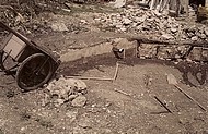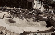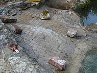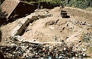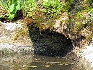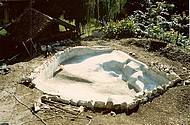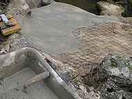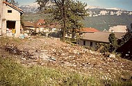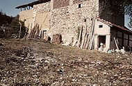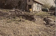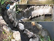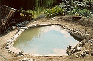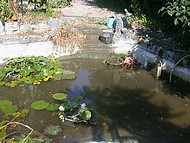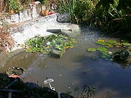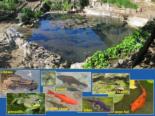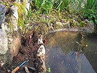 la mare... sous ce tas de grabats, au début du siècle dernier, les jeunes filles de la ferme venaient s'assoirent devant le "bassin en cœur", pour bavarder, m'a raconté une vieille voisine.... je pris alors le courage de recreuser, reformer, bétonner... et le bassin est réapparu, il est devenu la mare, refuge des grenouilles et des carpe koï. |