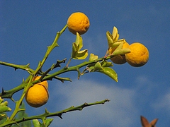 ![]() par son port original, sa floraison printanière très parfumée et ses fruits d'automne. Ses fortes épines, en font aussi une utilisation défensive dans les haies. On l'utilise aussi souvent comme porte-greffe des citronniers et des orangers. |
