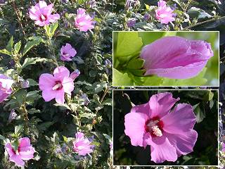 en arbre, ketmie des jardins l'hibiscus a les accents enchanteurs des tropiques. Le notre est la forme arbustive "althéa" et son abondante floraison estivale. Les fleurs, corolles mauves de 6 à 8 cm de diamètre, solitaires ou portées par paires sont éphémères, mais la floraison se renouvelle constamment de juillet à octobre. |