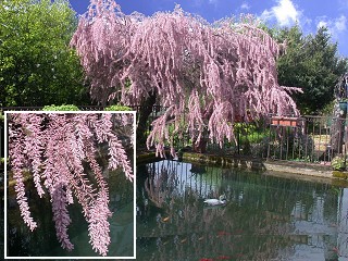 notre tamaris s'est bien acclimaté chez nous! Son tronc tortueux, ses branches longues et souples, fléchissent sous le poids de l'abondante floraison et embaument les bords du bassin au printemps. Les fleurs pourpres sont de petite taille, mais par leur nombre et celui des épis l'effet reproduit dans le miroir du bassin est spectaculaire. Les rameaux légers sont alors chargés d'une myriade de fleurs qui les habillent entièrement, leur donnant un aspect des plus gracieux. Son feuillage plumeux ondule le long de l'année au gré des vents. |