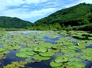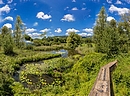 Au creux de collines boisées, mosaïque de tourbières et plans d'eau.