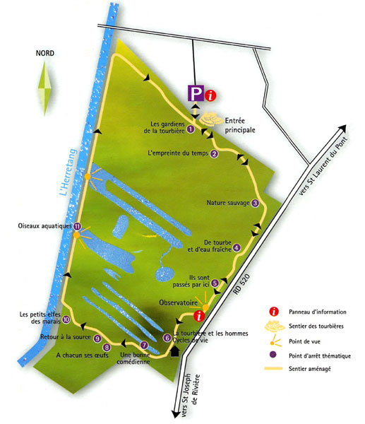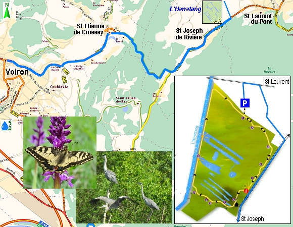 ![]() • Située à 400 m d'altitude à l'ouest du massif de Chartreuse, la tourbière couvre 65 ha sur les communes de St-Laurent-du-Pont et St-Joseph-de-Rivière. Reliquat d'une vaste zone marécageuse, elle est bordée par la route départementale et le canal de l'Herretang qui draine l'ancien marais pour alimenter le Guiers mort. Sa diversité biologique est le fruit d'activités humaines traditionnelles : pâture, fauche, exploitation de la tourbe... • L'homme friand de ce terreau pour le chauffage d'abord, puis pour les horticulteurs, la tourbière a fonctionné jusqu'en 1997, conservant sa superbe diversité biologique. La tourbière de l'Herretang, réhabilitée par le conseil général de l’Isère, est ouverte à la visite depuis 2000, elle est classée espace naturel sensible. ![]() • Les tourbières sont des écosystèmes formés de végétaux dont la croissance, dans certaines conditions climatiques, parfois topographiques, engendre l'accumulation d'importantes quantités de matière végétale. Celles-ci, après une transformation modérée biochimique et mécanique (décomposition très lente et très incomplète), forment une roche combustible renfermant jusqu'à 50 % de carbone : la tourbe. Au fil des siècles, la tourbe s'accumule. Il faut un siècle pour qu'elle s'épaississe de 3 à 5 cm. ![]() • Faune et flore Flore : 10 espèces patrimoniales : fougère des marais, gagée jaune, hydrocotyle commun, jonc aplati, laîche de bohème, petite urticulaire, inule de Suisse, peucédan des marais, rubanier nain, séneçon des marais Faune : 42 espèces patrimoniales dont 7 espèces d'oiseaux (locustelle luscinioïde, martin pêcheur, pie grièche grise, torcol fourmilier), 2 espèces de reptiles d'intérêt communautaire, 2 espèces de papillon (cuivré des marais, azuré de la sanguisorbe) Habitats : bouleaux, saule, aulne, prairies humides, roselières, étangs et mares, ruisseau... |